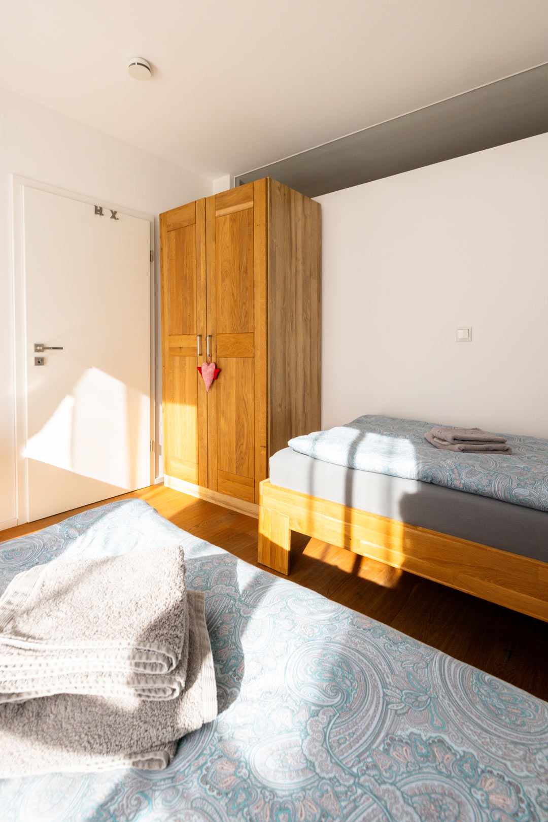 Die Wohnung ist ausgestattet mit einem großzügigen, offen gestalteten Wohn-, Ess- und Kochbereich, zwei Schlafzimmern (ein Schlafzimmer mit Doppelbett und ein Schlafzimmer mit zwei Einzelbetten) sowie zwei Bädern – eines mit Dusche und Badewanne und eines mit Dusche.