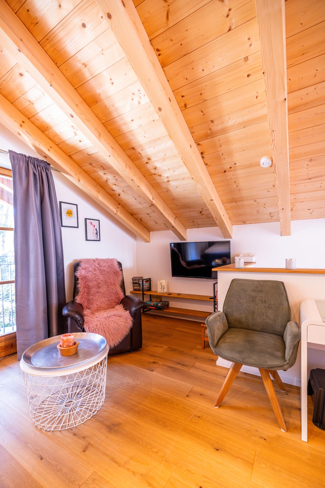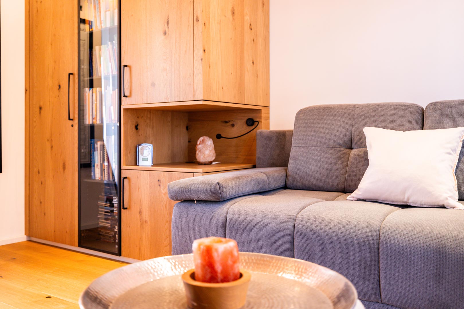Der helle Wohnbereich ist mit einer komfortablen Schlafcouch, einem Fernseher, einem Lesesessel sowie einem praktischen Schreibtisch ausgestattet. Die komplett eingerichtete Küche ermöglicht eine flexible Selbstverpflegung. Hochwertige Echtholzböden mit Fußbodenheizung und eine dezente, indirekte Beleuchtung sorgen für zusätzlichen Wohnkomfort.