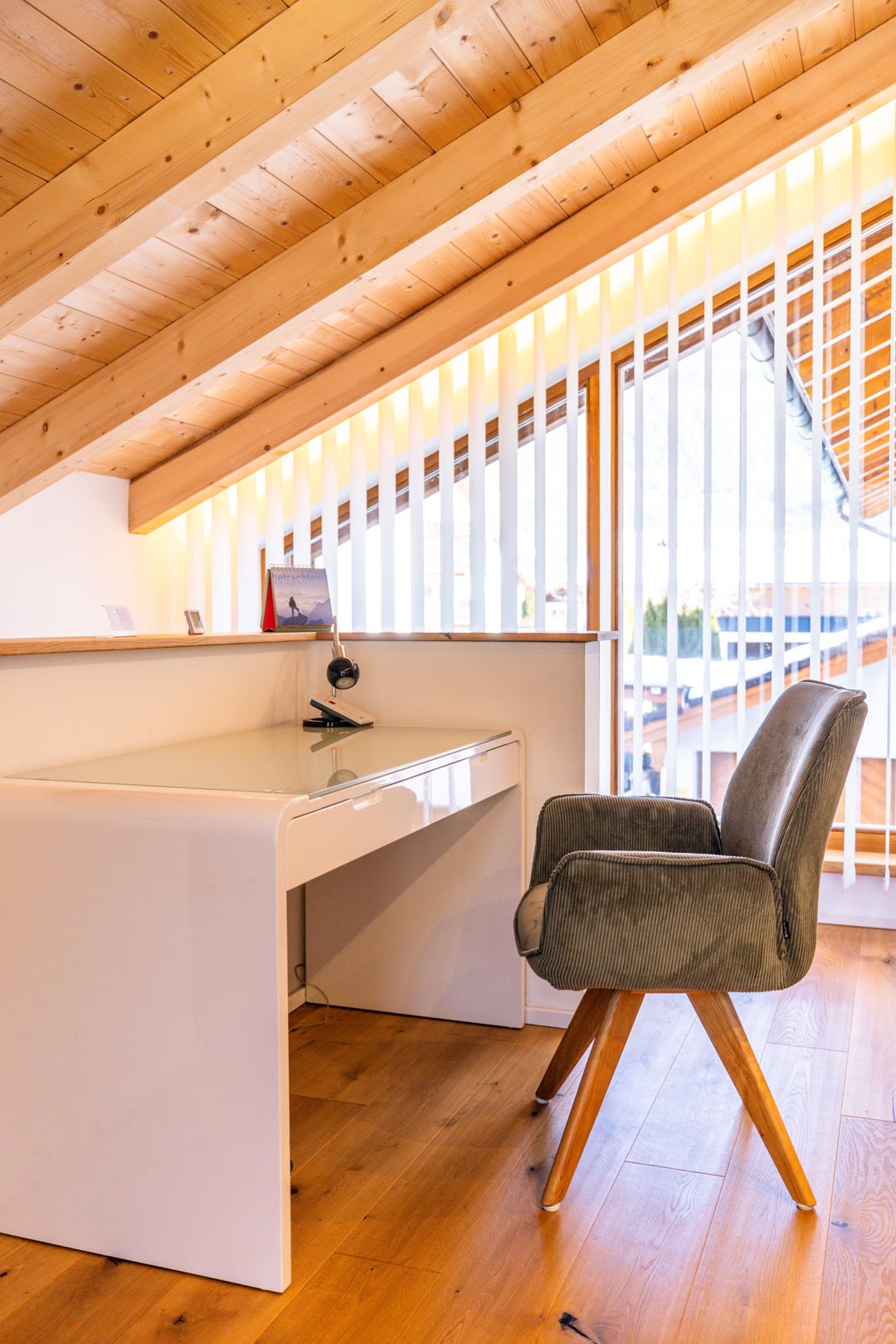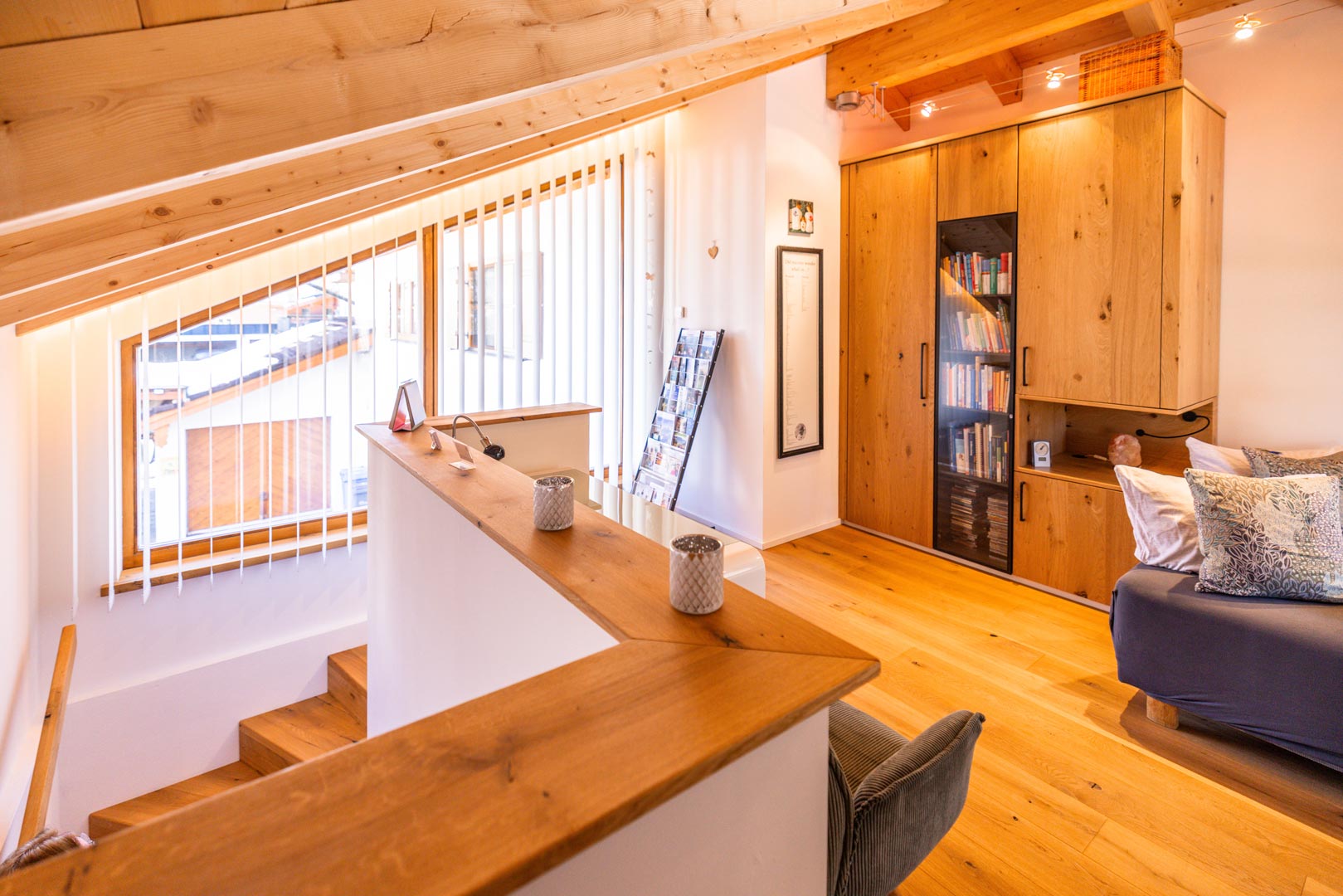 Der offen gestaltete Wohnbereich verfügt über eine hochwertige Schlafcouch, einen Fernseher sowie einen gemütlichen Lesesessel. Die voll ausgestattete Küche lädt dazu ein, Ihre Lieblingsgerichte selbst zuzubereiten. Echtholzböden mit Fußbodenheizung und indirekte Beleuchtung sorgen für ein besonders wohnliches Ambiente.